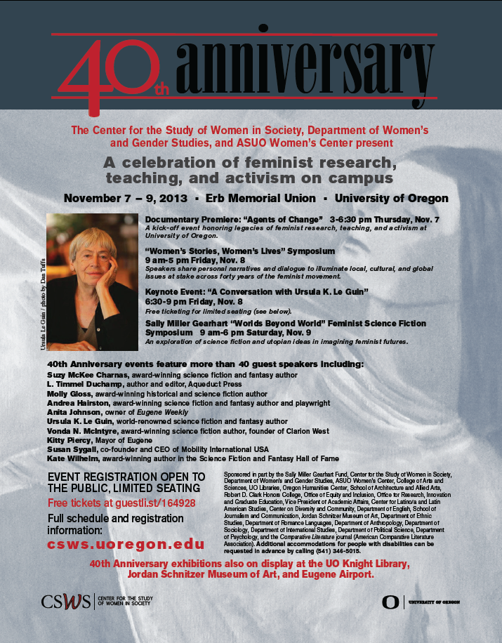 In about a month's time, the Center for the Study of Women in Society at the University of Oregon will be celebrating their 40th anniversary with two symposiums, one of them focusing on feminist science fiction. All the programming will be free and open to the public. So, if you live in the Pacific Northwest, you might well want to consider attending, especially when you see who will be participating. (I'm thrilled to say, the list includes several Aqueduct Press authors. including me.)