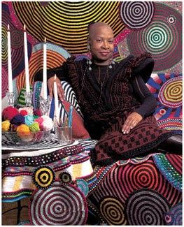 This wildly colored textile sculpture is large enough for a priestess or a mother and child to climb inside it, and it is vaguely reminiscent of the intricately woven Camerounian Bamileke crowns worn in Central Africa (or perhaps more memorably, by ZZ Top).