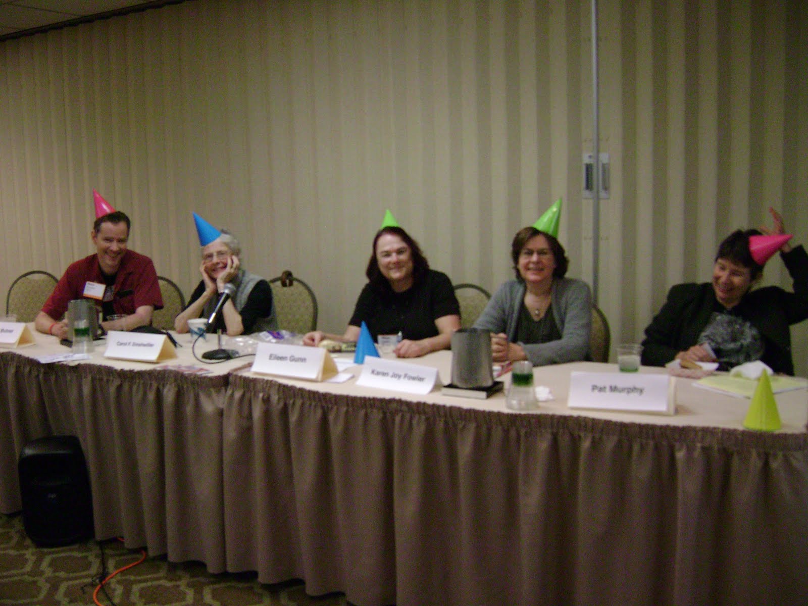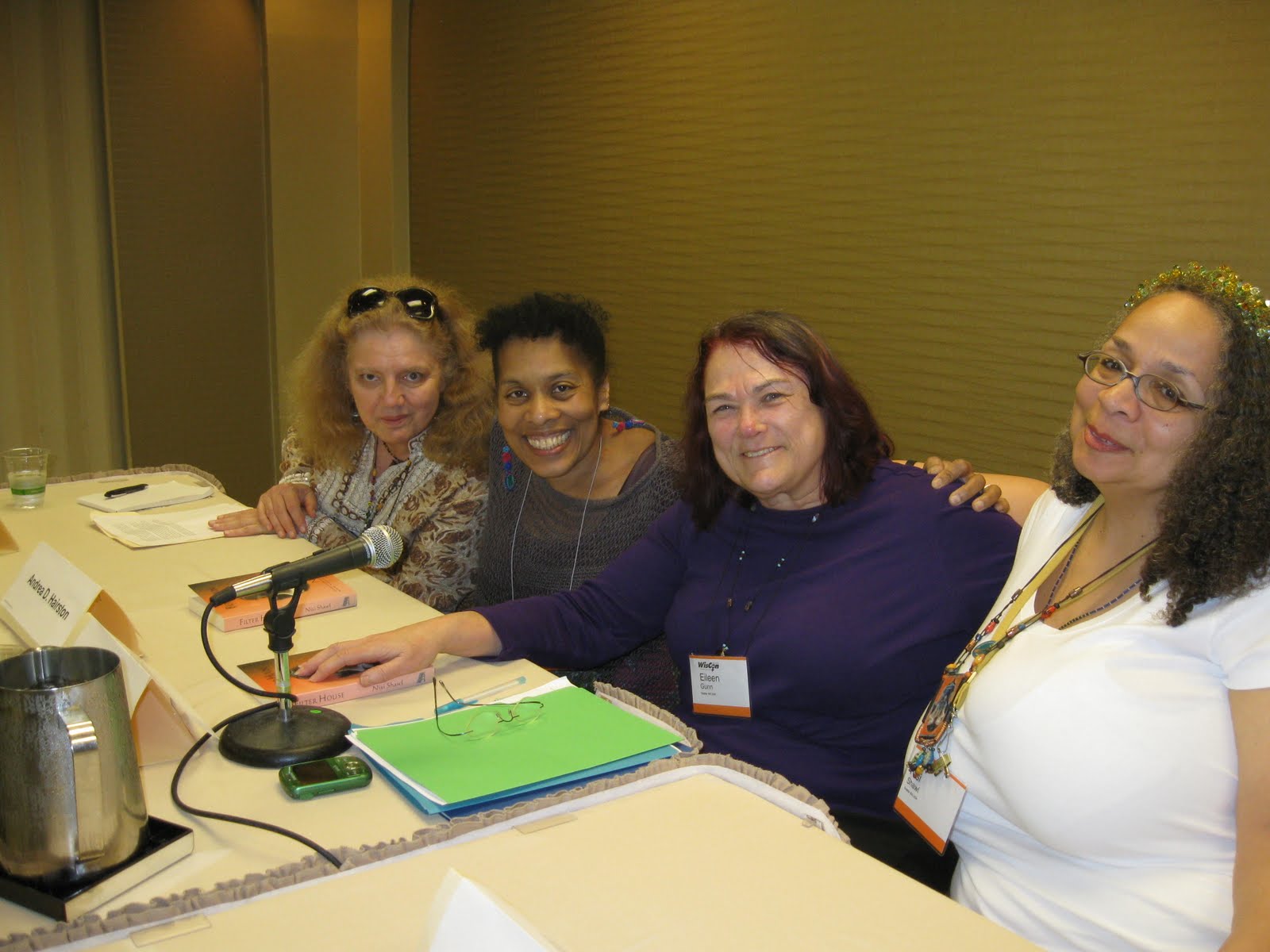 Panelists Eileen Gunn, Andrea Hairston, Nancy Jane Moore, Jef A. Smith. Smith was unable to appear because of his PM Press duties; but there was a Guest Panelist in the form of Nisi Shawl.