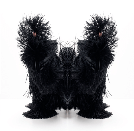 Nick Cave, a former dancer, has long been making soundsuits—full body costumes that mask the identity of the wearer and make sound as the wearer moves. The suits are beautiful and otherworldly. At the Black Eye group exhibition in May, he showed a video that captured a black-fringed soundsuit in motion. The video was altered to make a symmetrical pattern with one side mirroring the other. The result was a series of mesmerizing movements that piqued curiosity as the brain tried to categorize the image as alien, animal, or inanimate. It was a beautiful meditation on movement, at once otherworldly and serene. http://www.jackshainman.com/artists/nick-cave