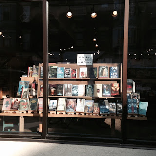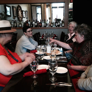 I tend to forget to take photos at WisCon, except for those I've gotten in the habit of doing-- chiefly of the Aqueduct Press-organized readings. Partly this is because I don't like to take photos without first getting permission from those who will be clearly identifiable in the photo (which pretty much rules out most candid photos), partly because I tend to get so caught up in talking to people that I forget. On our first night at WisCon, I remembered to take a photo of the window of Room of One's Own (which I of course stared admiringly at before entering the store), and a photo of Kath, Arrate, Nisi Shawl, and Margaret McBride at dinner. (Tom was leaning in back in his chair, & so, like me, who was talking the photo, is invisible.)