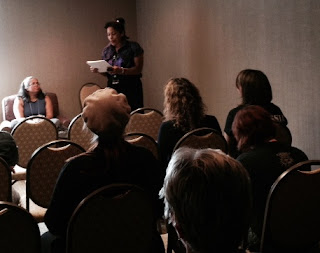 On Friday evening, the con held its opening ceremonies, during which Toastmaster Stina Leicht introduced the other Guests and delivered a heartfelt speech on the importance of diversity for science fiction. Saturday, at noon, I joined Nancy Jane Moore, Cynthia Ward, and Jacob Weisman of Tachyon Publications in a panel titled "How to Sell a Book to Aqueduct Press"; the four of us talked a lot about independent-press publishing in general, as well as Aqueduct Press in specific. Saturday mid-afternoon, I participated in a game-show format pitting "Pros" against "Fans." I was certain the Fan team would wiped the floor with us--but no. To my astonishment, we routed them. As Stina, who hosted the game, warned us, our job was to guess the answers written on the surveys con-goers had filled out, which needn't actually be "correct." It was a weird experience, I can tell you, when for the category of "Feminist SF Writers," the number-one answer was...me. (Ursula Le Guin was number 2.) In my penultimate programming item, Chris Brown and Madeleine Rose Dimond interviewed me. (See below.) And on Sunday afternoon, I read a portion of "A Question of Grammar" from Never at Home and--because I'd been allotted an entire hour for my reading--had the pleasure of engaging in a fascinating conversation with my small audience.