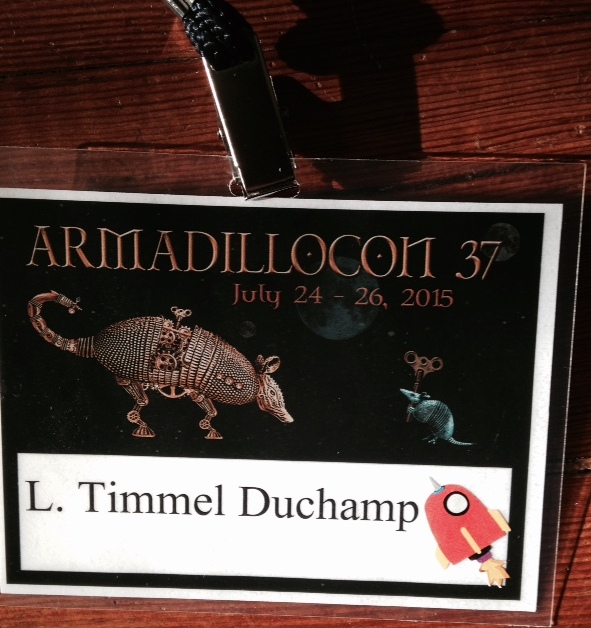 Although I took notes on the panels I attended, when I got home I discovered I couldn't sufficiently decipher my own hurried scrawl to make sense of them. But, though I can't offer you cogent summaries of the panels I attended, I can offer you the recording Chris Brown made of my Editor Guest interview-- or, rather, a link to it. (Although it is easy to post videos on this blog, audio recordings are something else...) You can find the recording of the interview on my website, here: http://ltimmelduchamp.com/ltimmelduchamp.com/interview-Armalillocon.