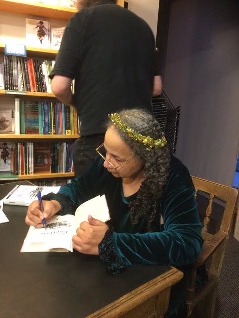 Yesterday, Tor released Nisi Shawl's debut novel, Everfair, and last night at University Bookstore in Seattle, a crowd of sixty hung on Nisi's every word spoken and note sung. No one who's been to a recent reading by Nisi will be surprised to hear that she opened her reading with a song important to the characters in her just-released Everfair; but not only did she sing a capella, she also directed the audience to join in the chorus (which we all did). Flashing us a mischievous smile, she promised to read us a sex scene--which she did--but I had to laugh when someone later, standing in the long queue of people waiting to get their copy of the book signed, grumbled with amusement that it was actually a scene of sex interrupted. At any rate, I came away with my own copy in a mood of exultation.